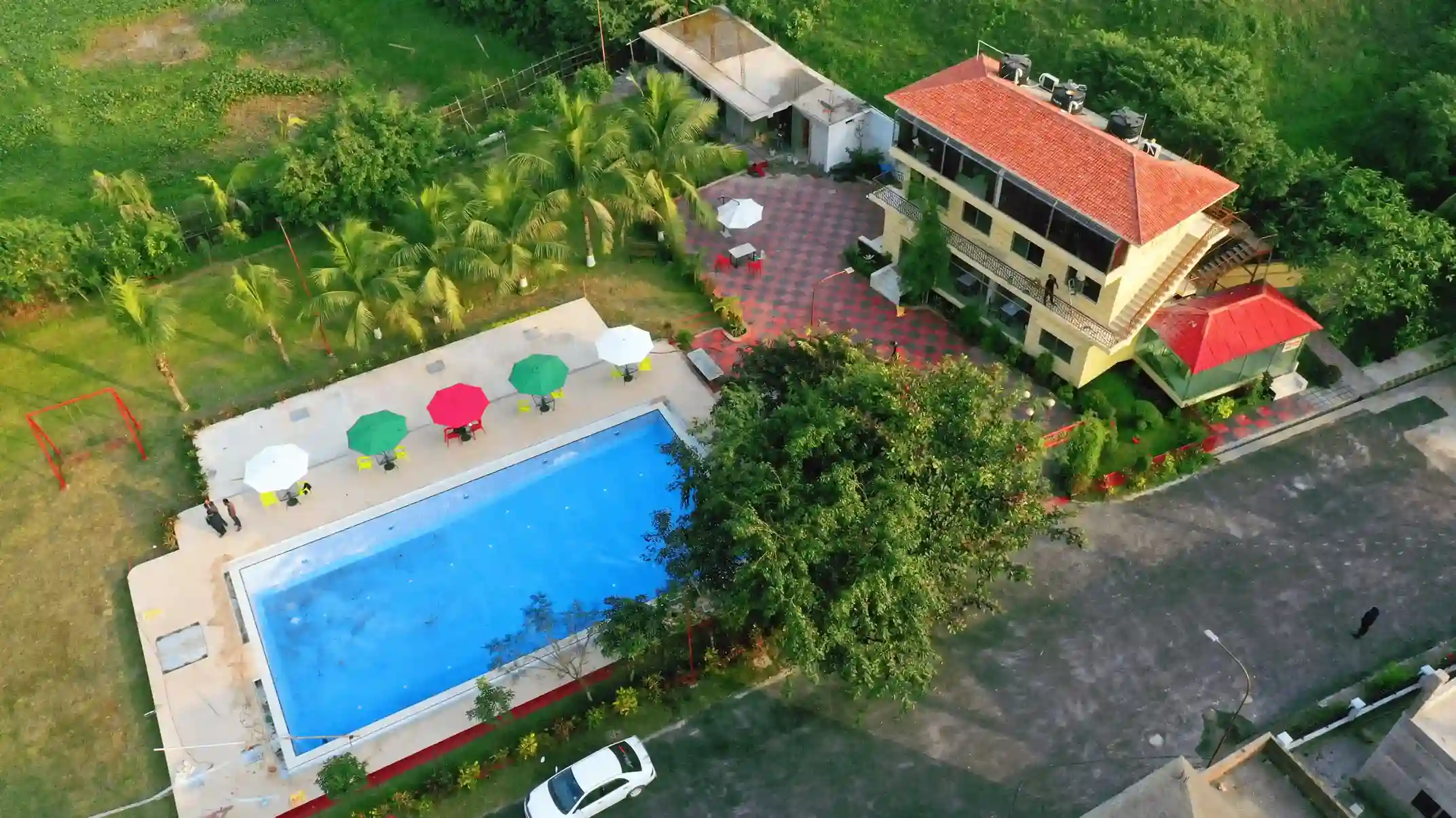 Outside, the bungalow boasts a 400 sq. ft. green lawn, perfect for relaxation and activities. Enjoy panoramic views and the evening sky from the family terrace or the Full-Moon Terrace, designed for moonlit nights.